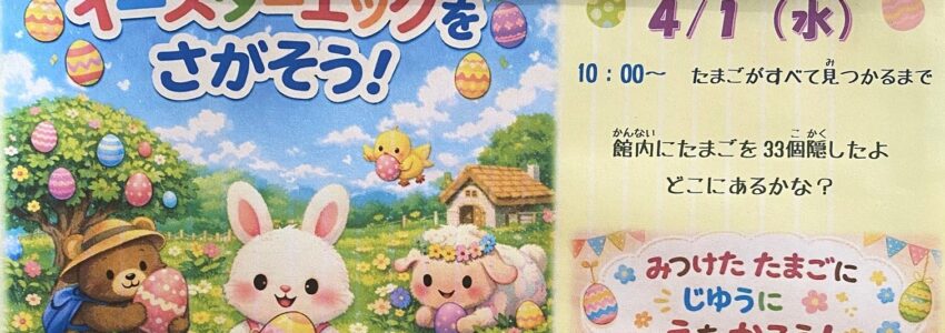 イースターのたまごを探そう! 2026 / 03 / 24 お知らせ 目次 - シェア 4月1日(水)の「イースターのたまごを探そう!」は いみけたたまごは、自由に絵を描いて 持ちかえることができます ※たまごがぜんぶみつかるまで! 時間 10:00~ « ママヨガ