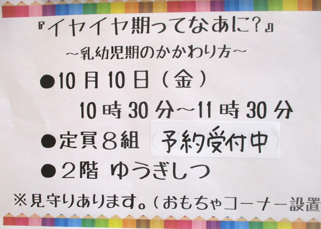 10月10日(金)のイベント「育児講座」乳幼児期の子どもとの関わり方」 2025 / 10 / 08 お知らせ 目次 - シェア 10月10日(金)の「育児講座」は 「乳幼児期の子どもとの関わり方」~イヤイヤ期ってなあに?~ 講師 町田市地域子育て相談センター公認心理師 定員 10組(事前予約制) 時間 10:30~11:30 当日は10:00から受付開始 見守りボランティアさんがいます « 10月のお知らせです 10月14日(火)のイベント「てくてく」 »