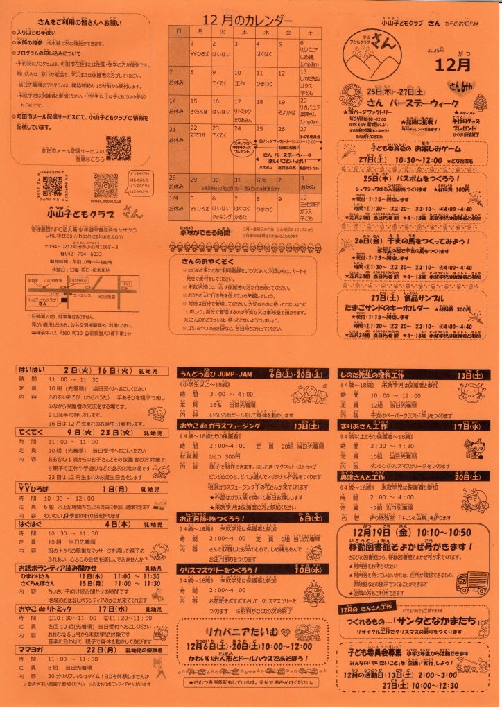 12月のお知らせです 2025 / 12 / 01 お知らせ 目次 - シェア 12月のお知らせを掲載しました。 « 2024年度利用者アンケート集計結果を館内に掲示しました。 12月2日(火)のイベント「はいはい(手形押し)」 »