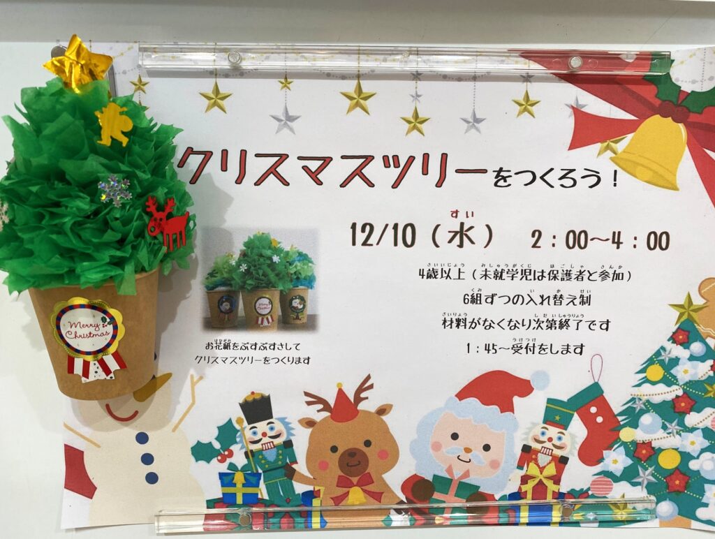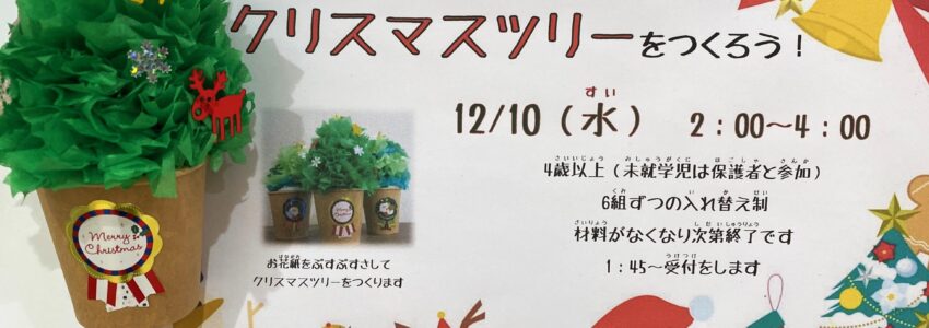 12月10日(水)のイベント「クリスマスツリーをつくろう!」 2025 / 12 / 06 お知らせ 目次 - シェア 12月10日(水)の「クリスマスツリーをつくろう!」は お花紙をぷすぷすさして、クリスマスツリーをつくります 材料がなくなり次第終了 時間 2:00~4:00 4歳~18歳 未就学児は保護者と参加 « 12月9日(火)のイベント「てくてく」